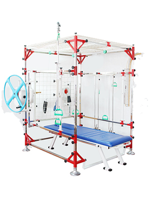 多功能訓(xùn)練器(八件組合)傾斜部的上端與彎管部的一端相連接,彎管部的另一端與主架體的中部相連接,主架體的底端置于前底腳上,主架體的頂端連接有彎架體,主架體的前表面設(shè)有靠墊,靠墊后表面通過拉銷活動連接有兩個拉臂,調(diào)節(jié)立柱的傾斜部上通過調(diào)節(jié)拉銷連接有彈力繩調(diào)節(jié)座,彈力繩調(diào)節(jié)座連接有彈力繩組的一端,彈力繩組的另一端穿過彈力繩滑輪座連接有第一鋼絲繩,第三滑輪旁設(shè)有第一鋼絲扣,第一鋼絲扣連接有第二鋼絲繩的一端,第二鋼絲繩的另一端依次穿過各滑輪連接有鋼絲扣。